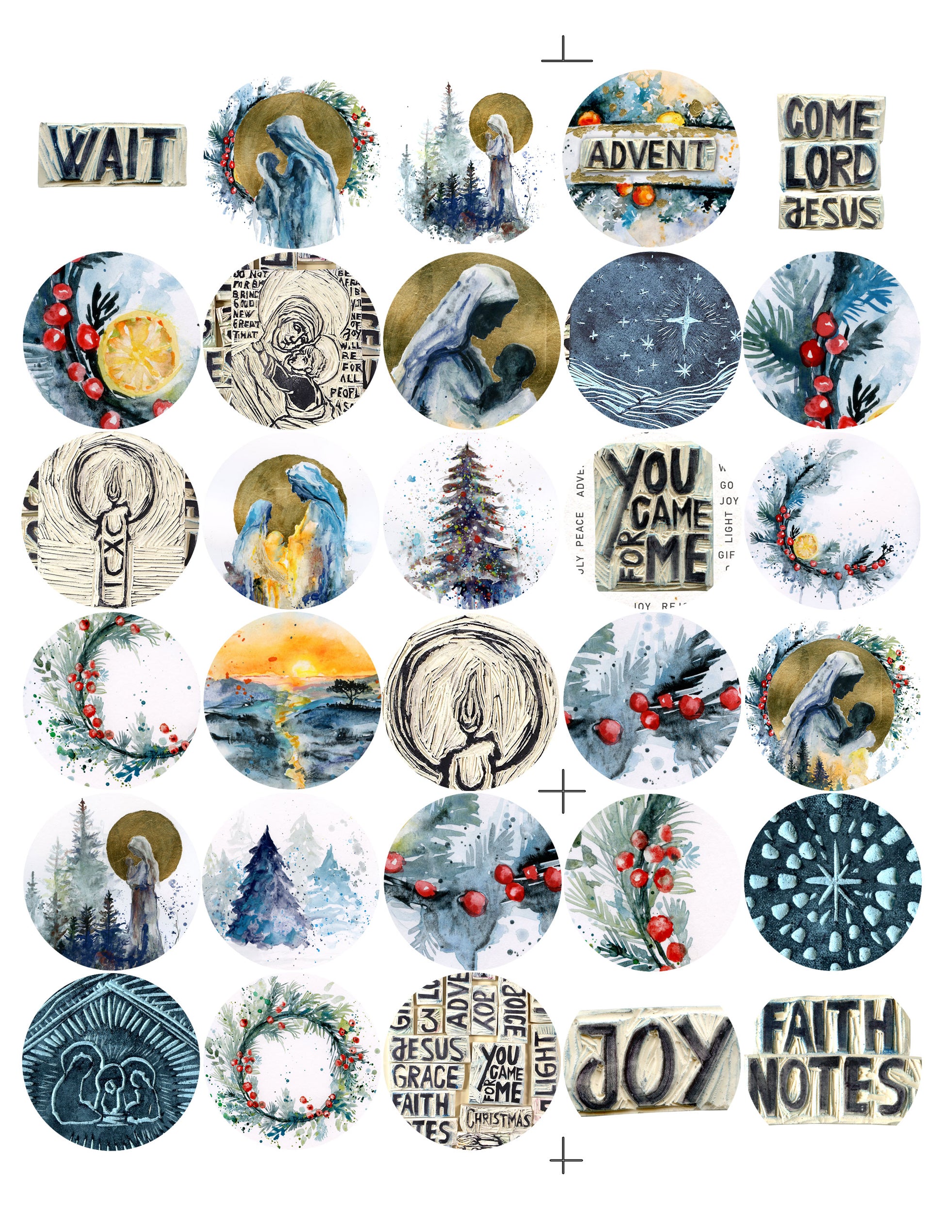 A lovely digital bundle containing the images from the sticker pack, extra card journaling pack, Daily Advent Scripture Reading pack, the 3.5x2 Bible verse and illustrations cards - all these are add-ons for the Advent kit.