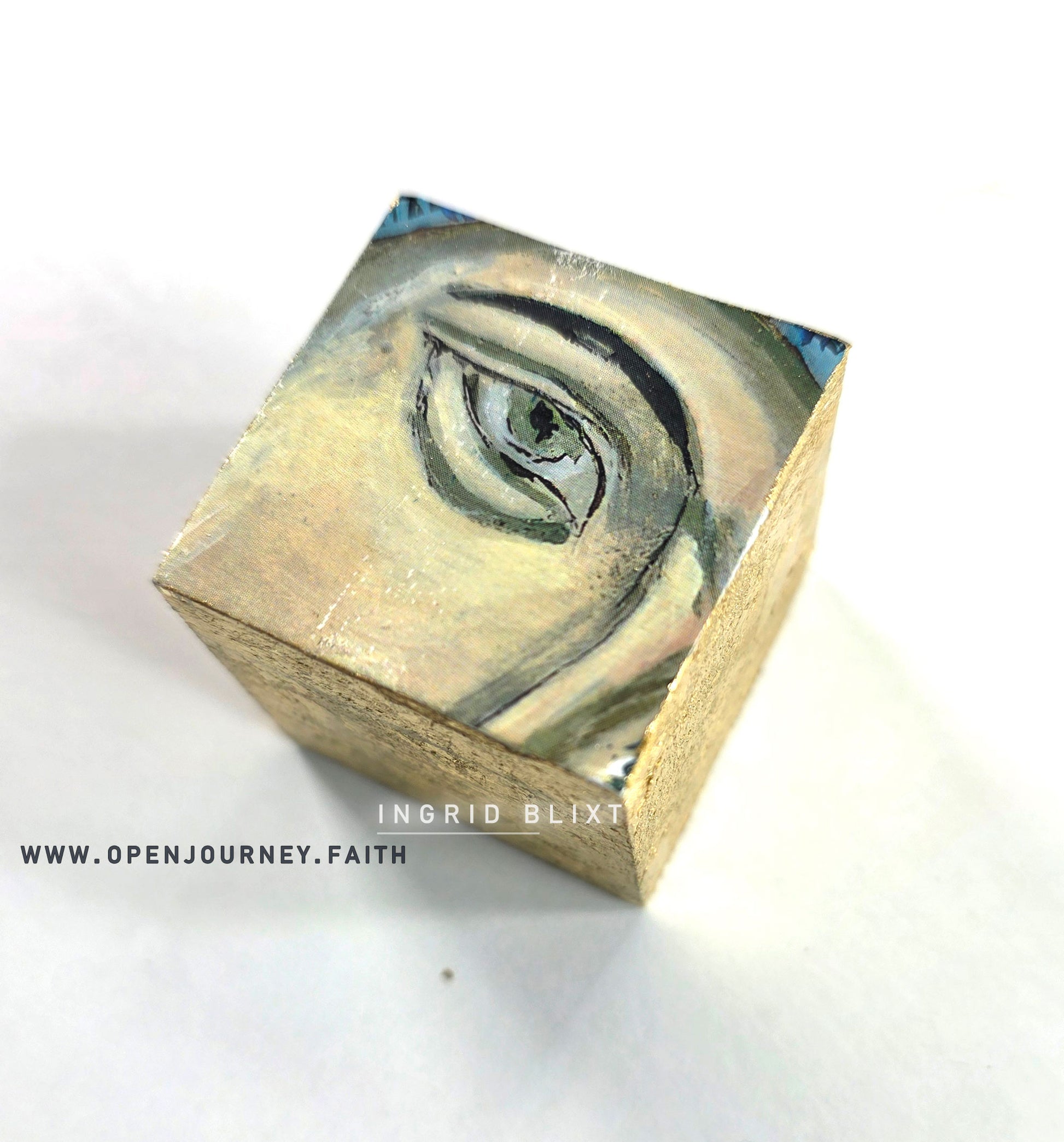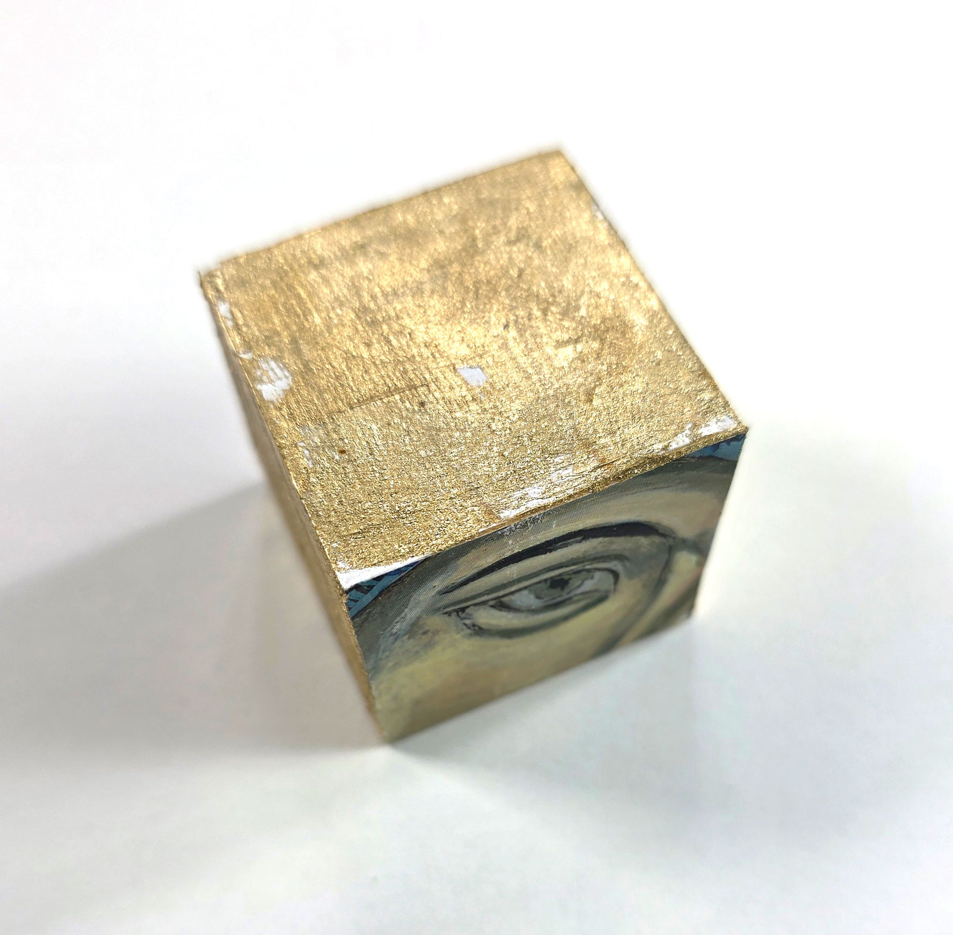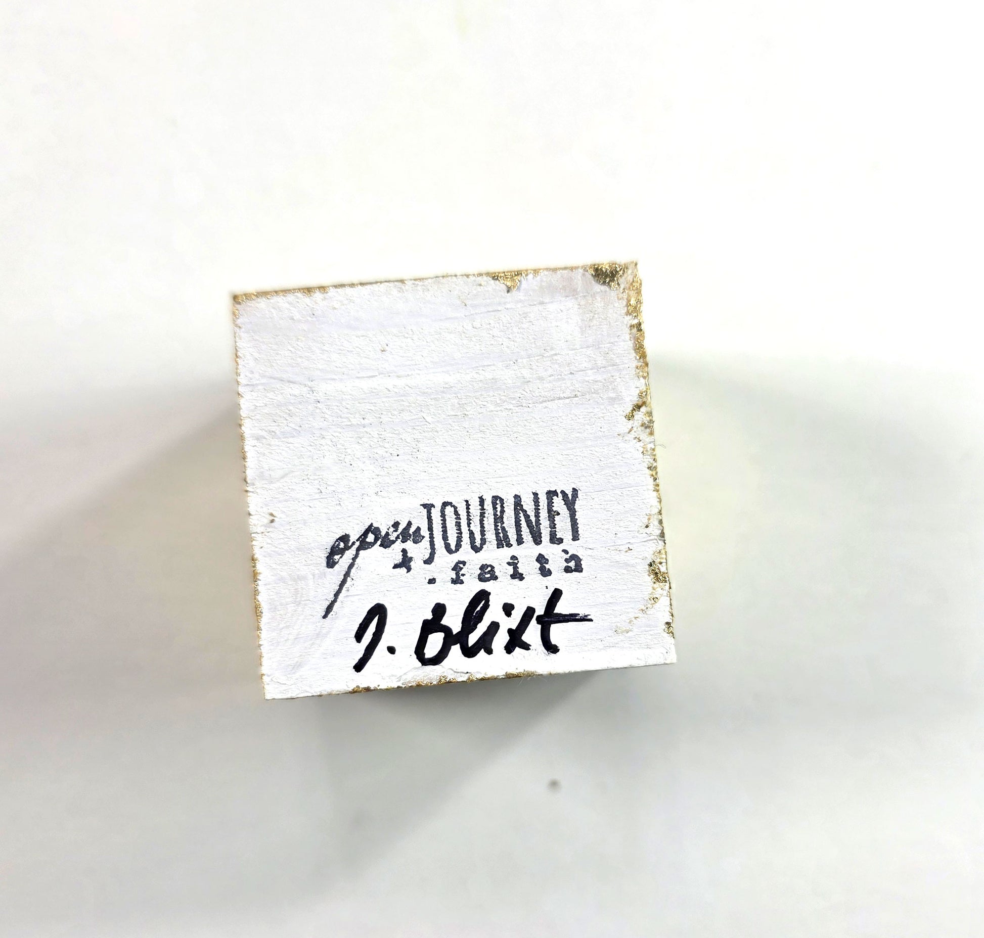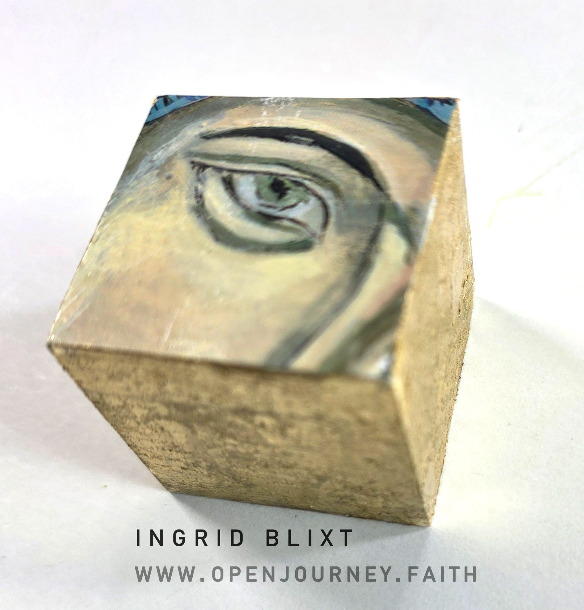 The Byzantine style icon is done on a wooden surface (cube), measuring 2"x2" and 2" deep. The sides are finished with gold leaf. The artwork can sit on a shelf. Beautiful from all angles!