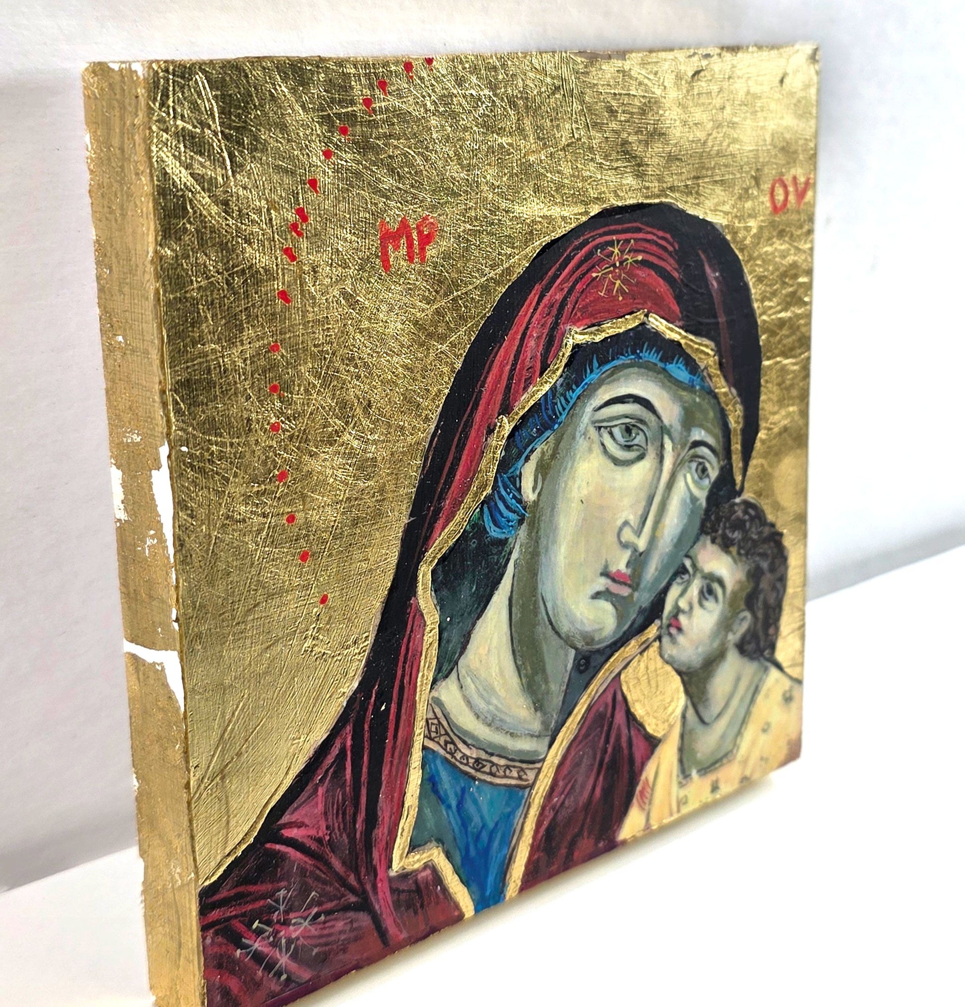 The mix media icon is done on a wooden surface, measuring 5"x5" and 0.5" deep. The sides are finished with gold leaf. The artwork can sit on a shelf or hang on a wall. Beautiful from all angles!