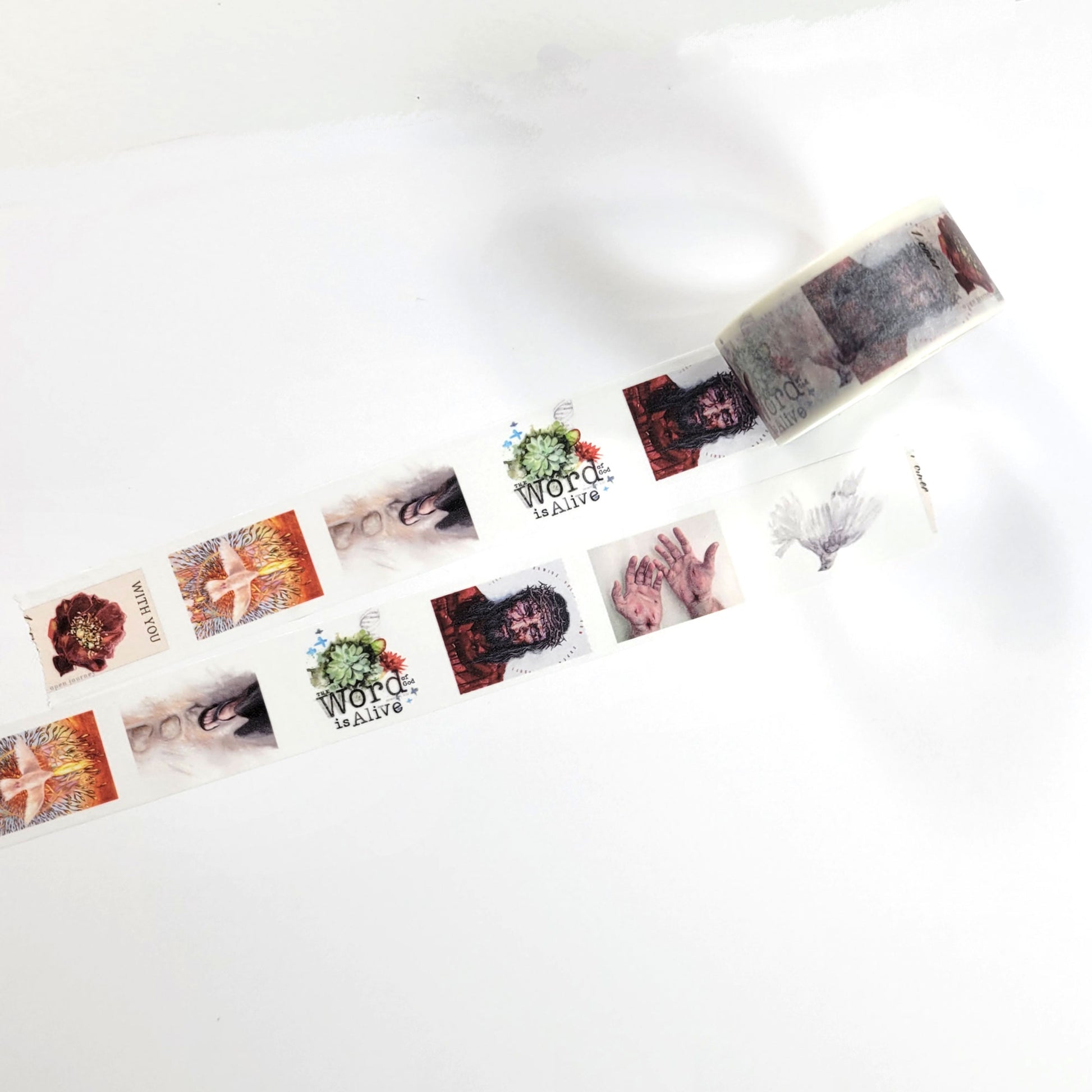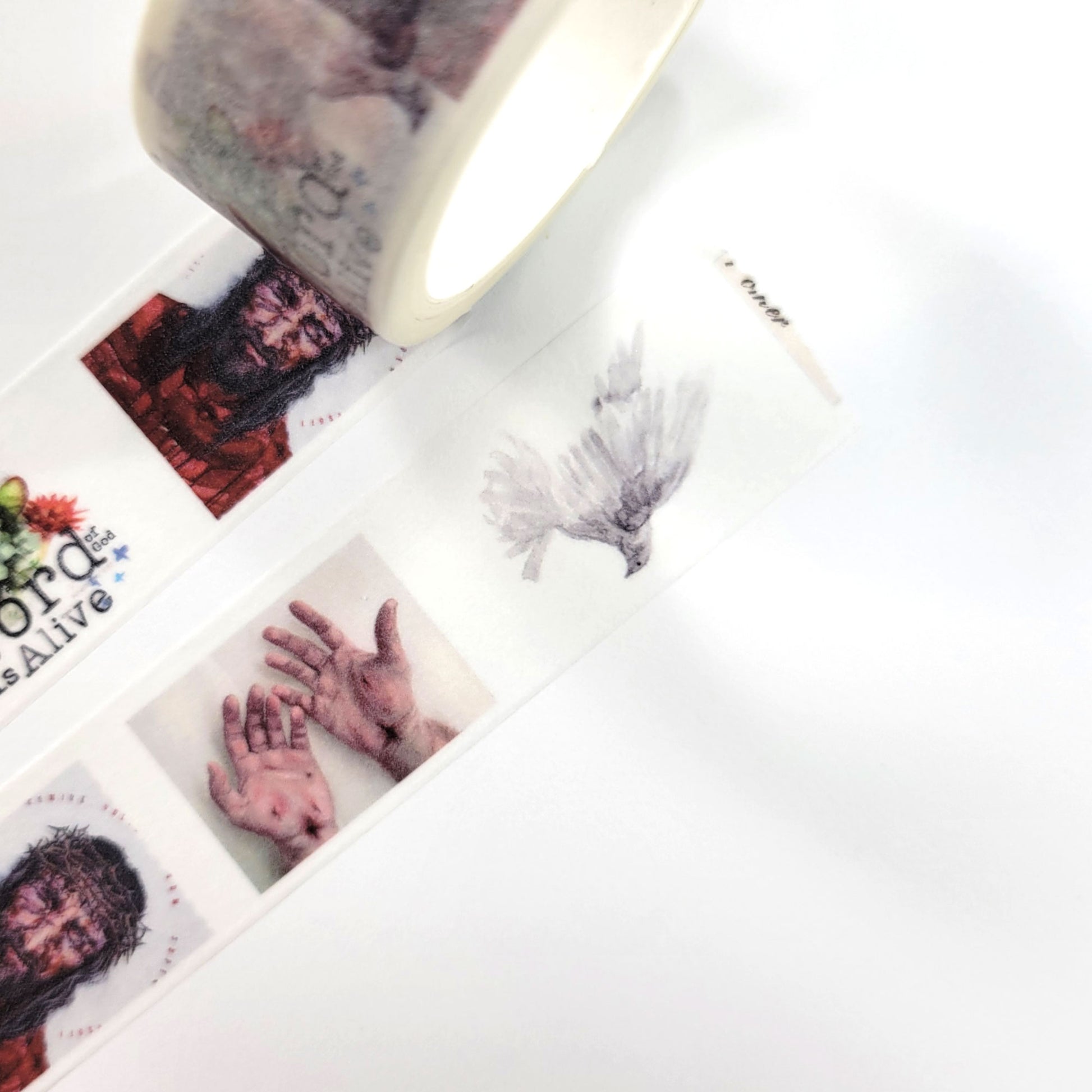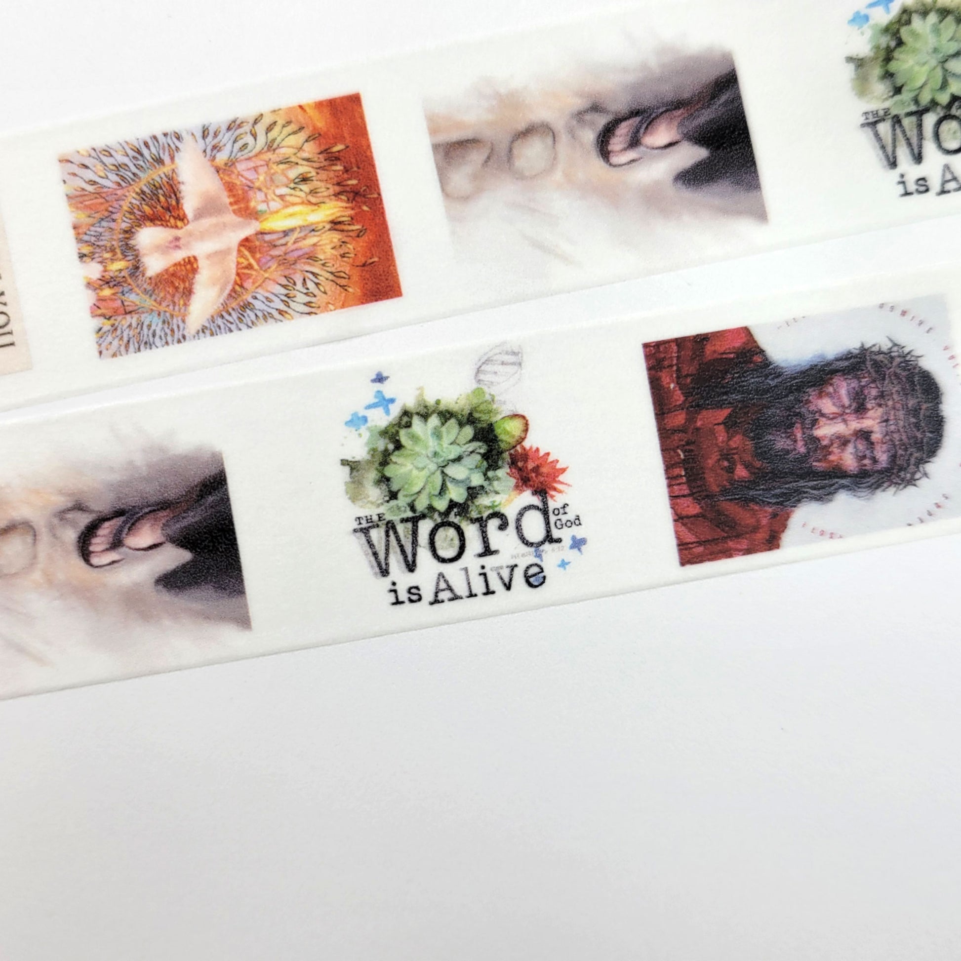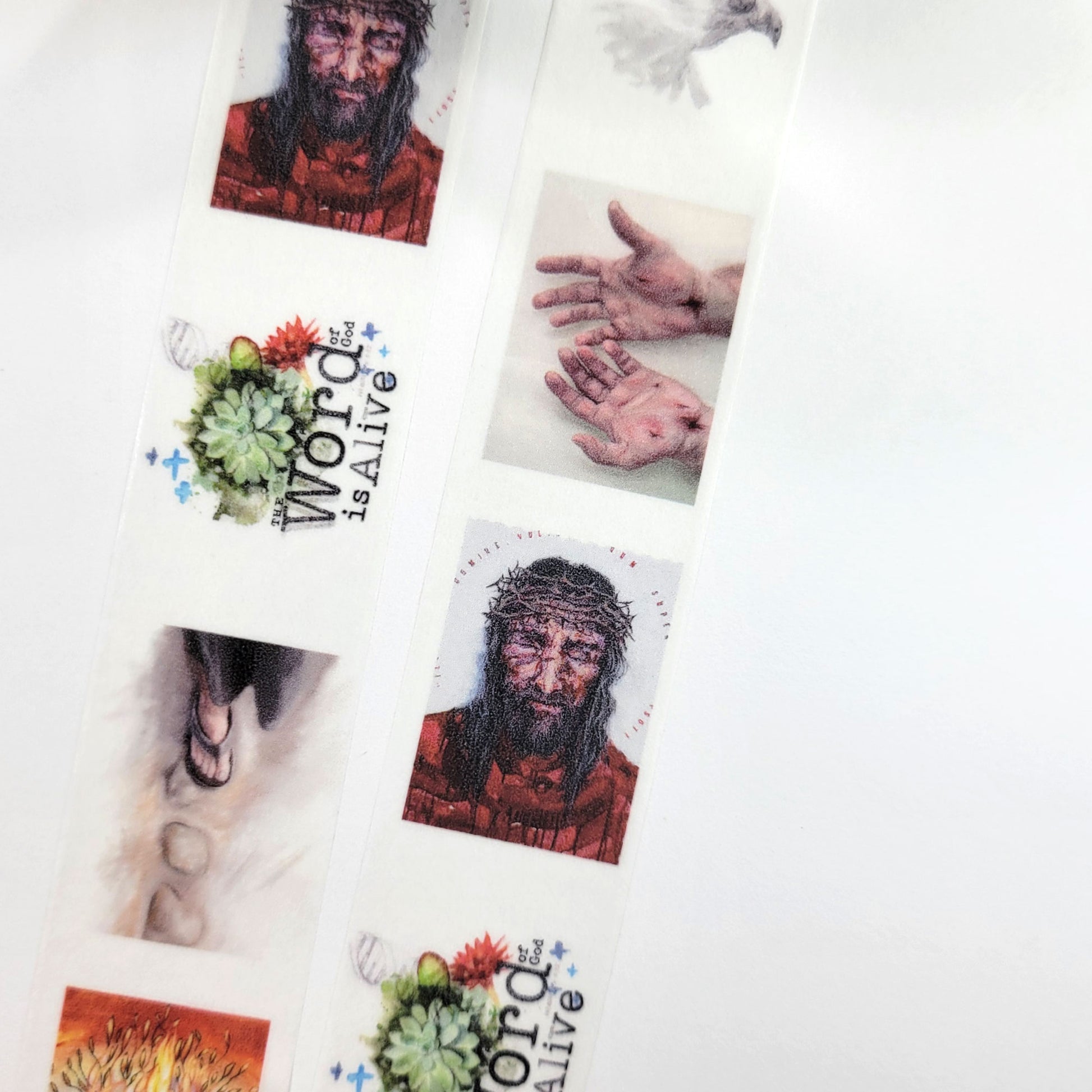 The washi tape measures 0.78" wide and 196" long (2cm x 5m). It features images from various Open Journey Bible Journaling kits and Ingrid Art Studio artworks.