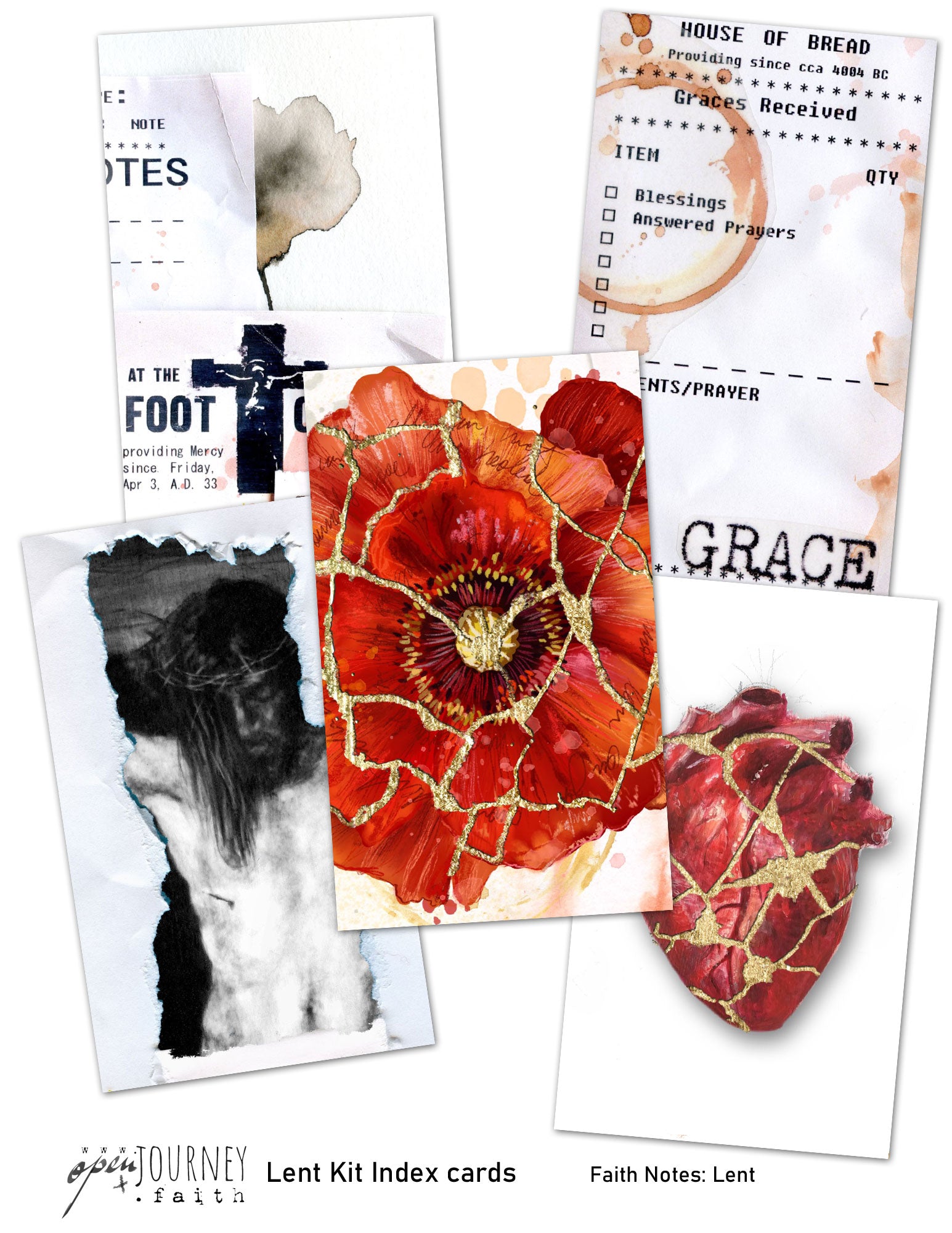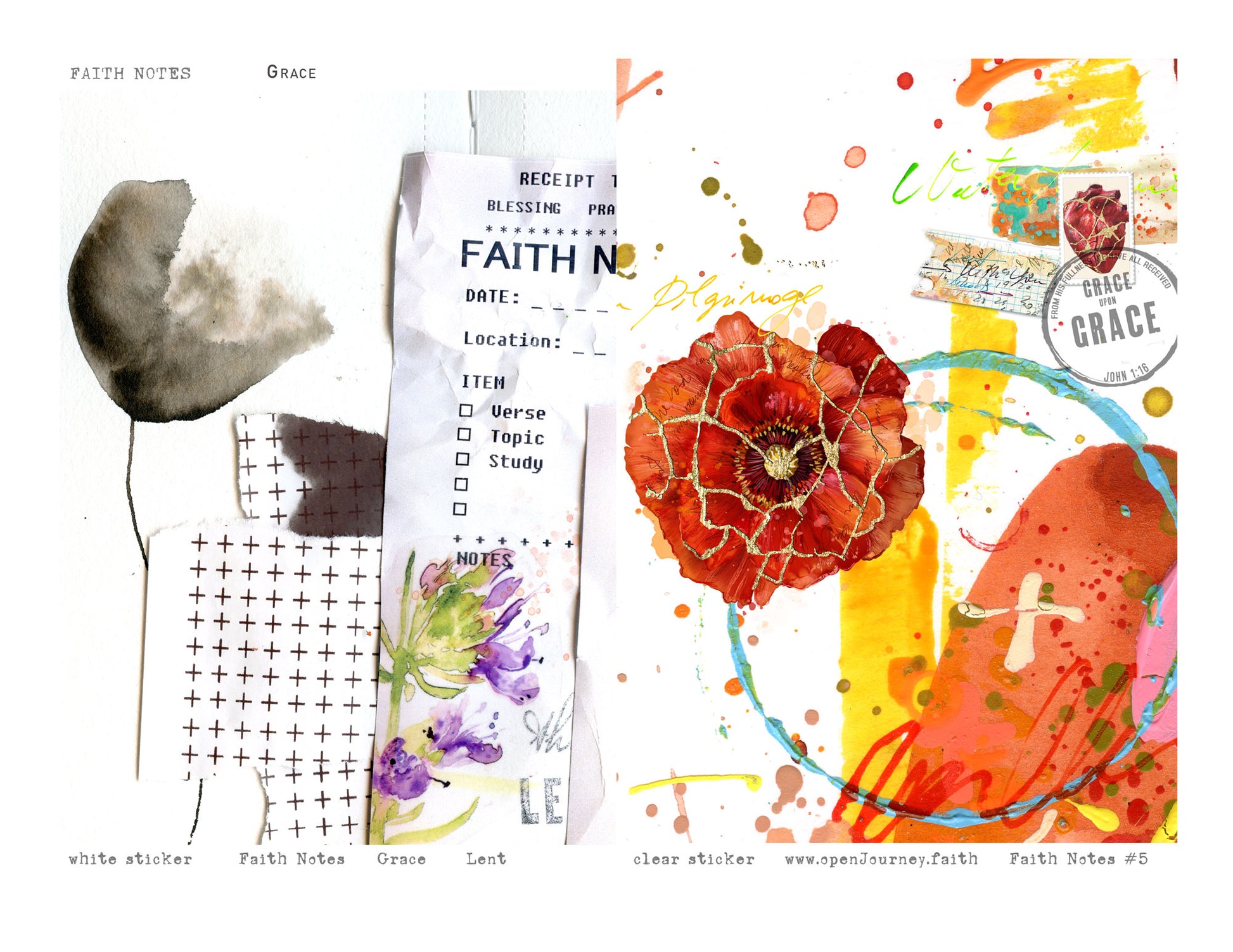 The original artwork, from watercolor paintings, photography, drawings and various mixed media techniques, accompanies the devotional to be used in your journaling, offering a visual aid to your meditations. It comes in the form of stickers and printed images on card stock, along with stamp sets or stencils which are separate additions to this kit.