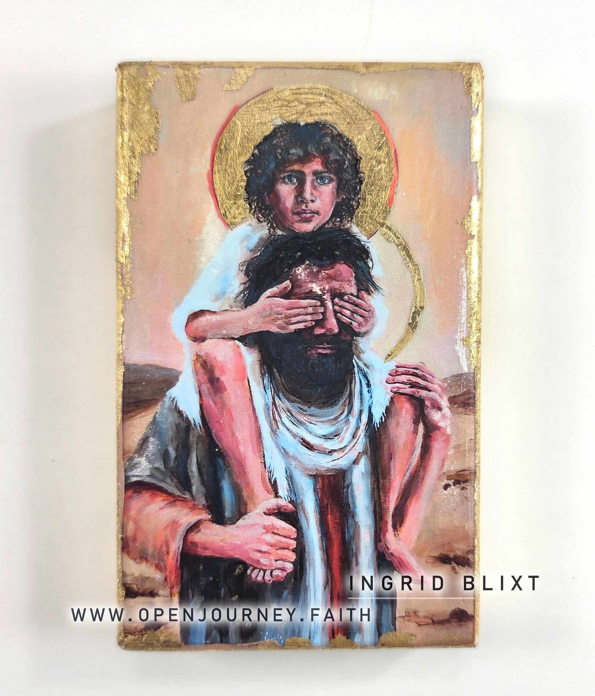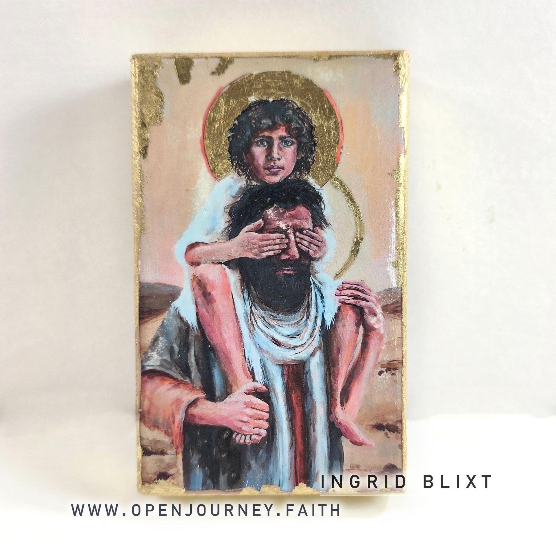 The artwork represents Jesus as a young boy riding on Joseph's shoulders, playfully shielding his eyes. The way He is inviting us into the mystery of faith is disarming and incredibly beautiful and unexpected, reminding us "for we walk by faith, not by sight."