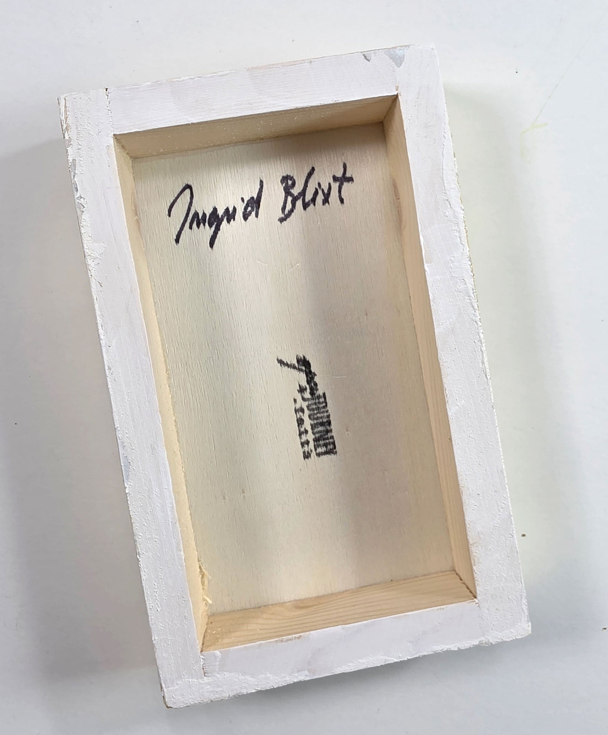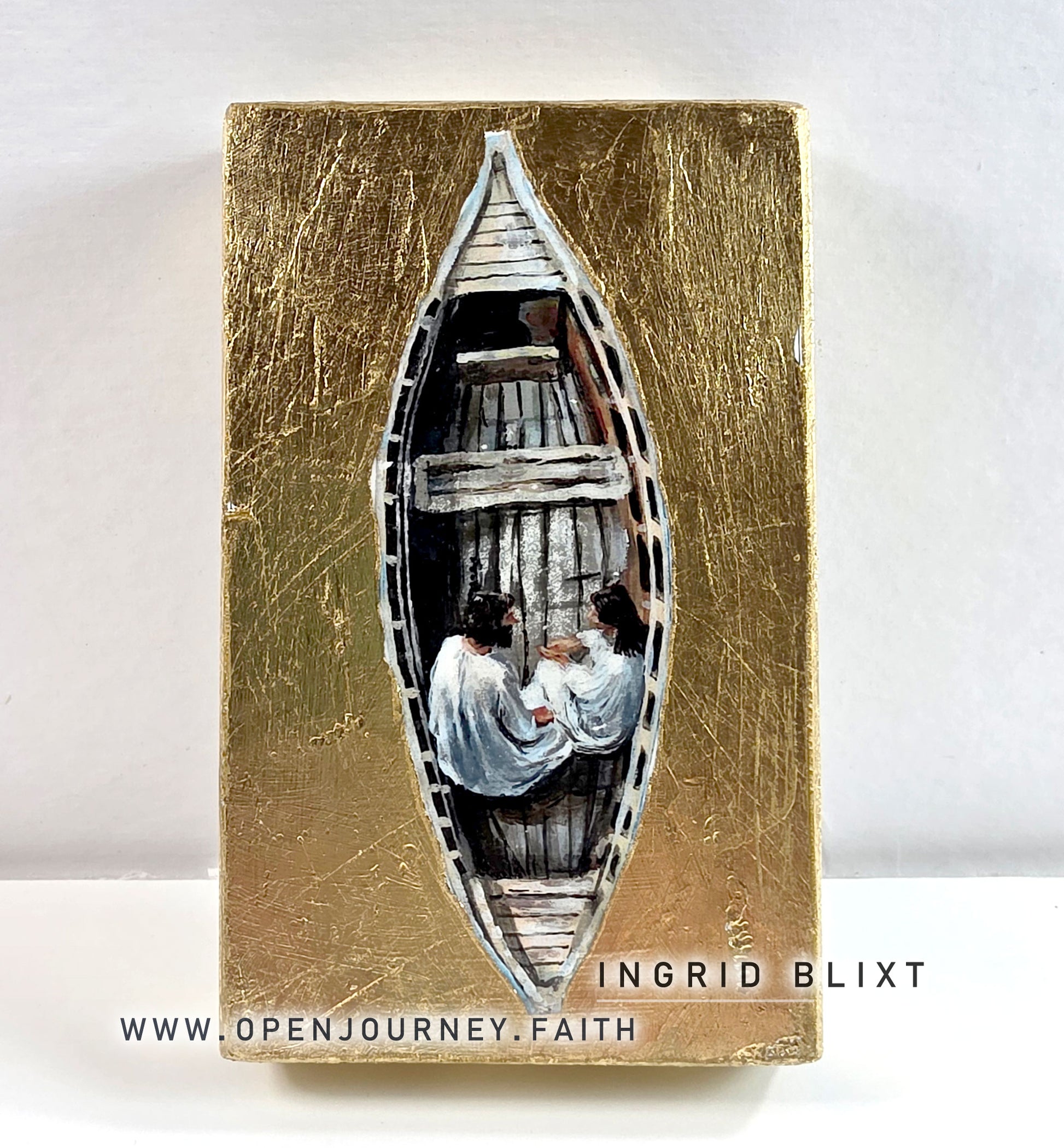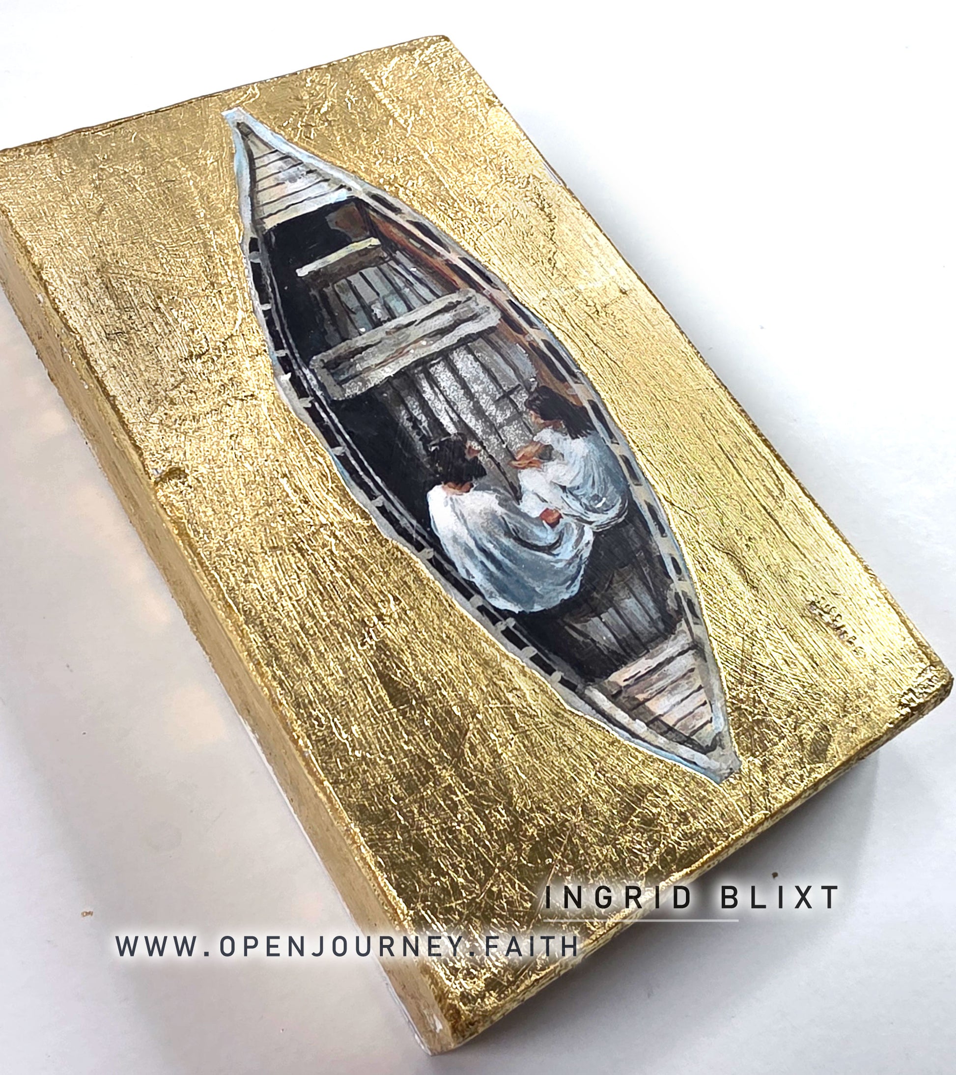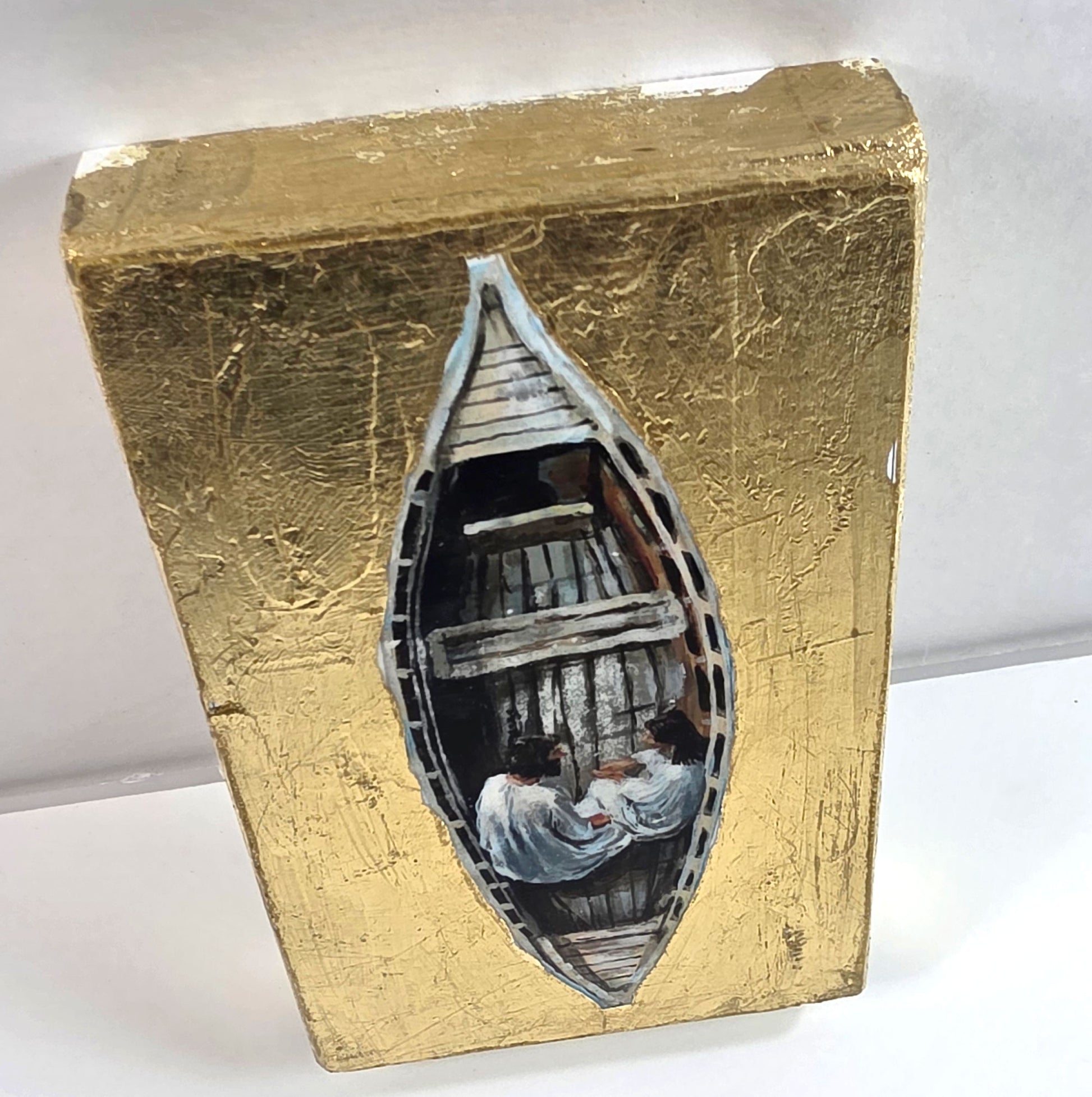 The artwork is done on a wooden surface, measuring 3x5" and .5" deep. The sides are finished with gold leaf. The artwork can sit on a shelf or can hang on the wall. Beautiful from all angles!