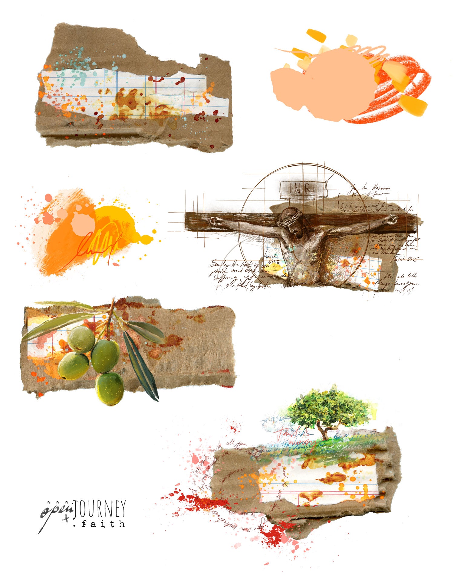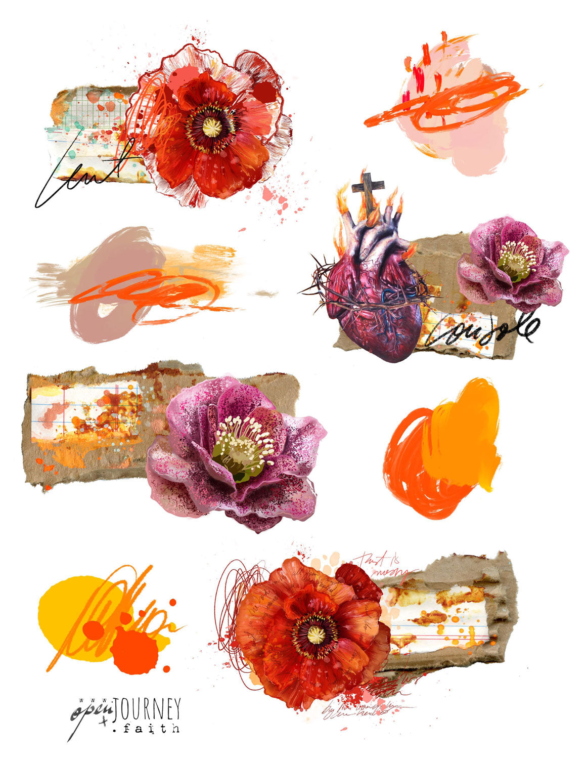 The artwork for this kit brings together a variety of mediums from watercolor and ink drawings to digitally drawn artwork and photography. The messy feel of some of the mixed media artworks contrasts with the smoothness of other mediums which to me reflects the contrast between our anguish, daily problems and how we are being drawn to peace in Christ.