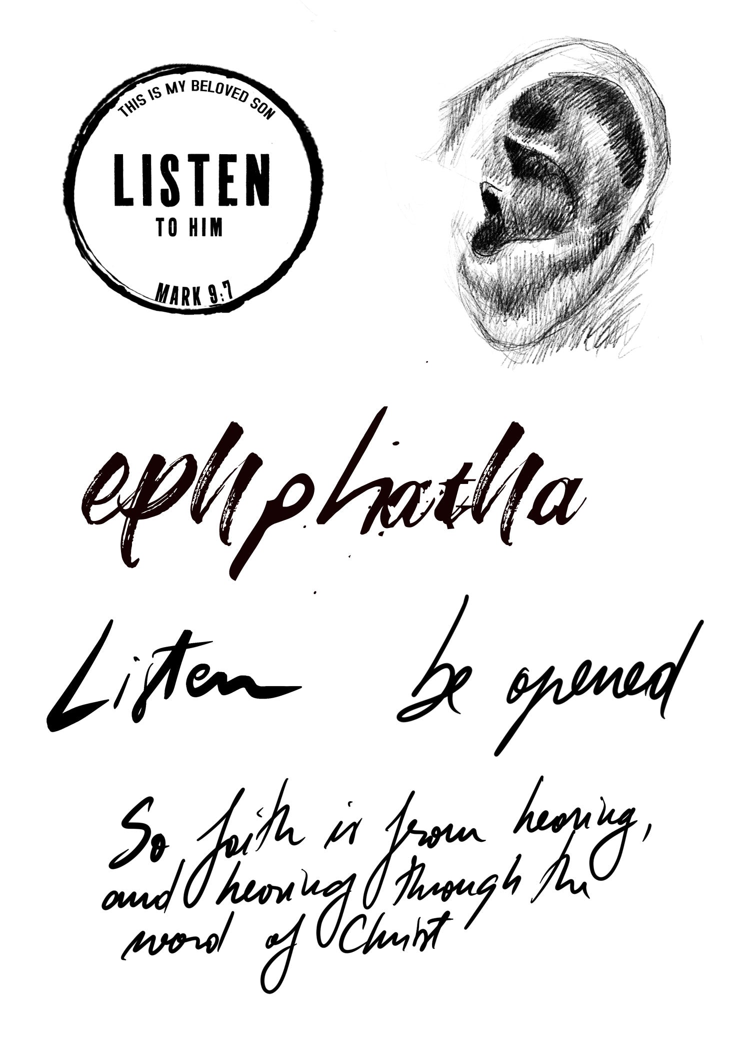 The text reads: Ephphatha, Listen, Be opened, "So faith comes from hearing and hearing through the word of Christ." Romans 10:17