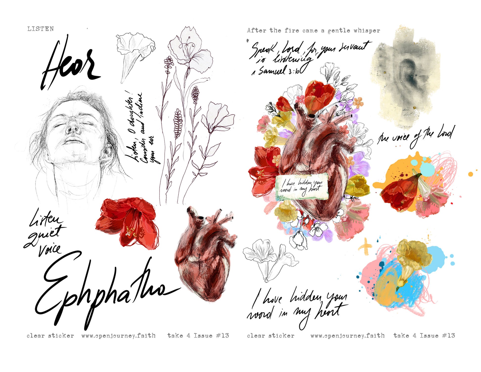 The original artwork that accompanies the devotional and kit is meant to be used in your journaling, offering a visual aid to your meditations. It comes in the form of stickers and printed images on card stock, along with stamp sets and other add-ons which are separate additions to this kit.