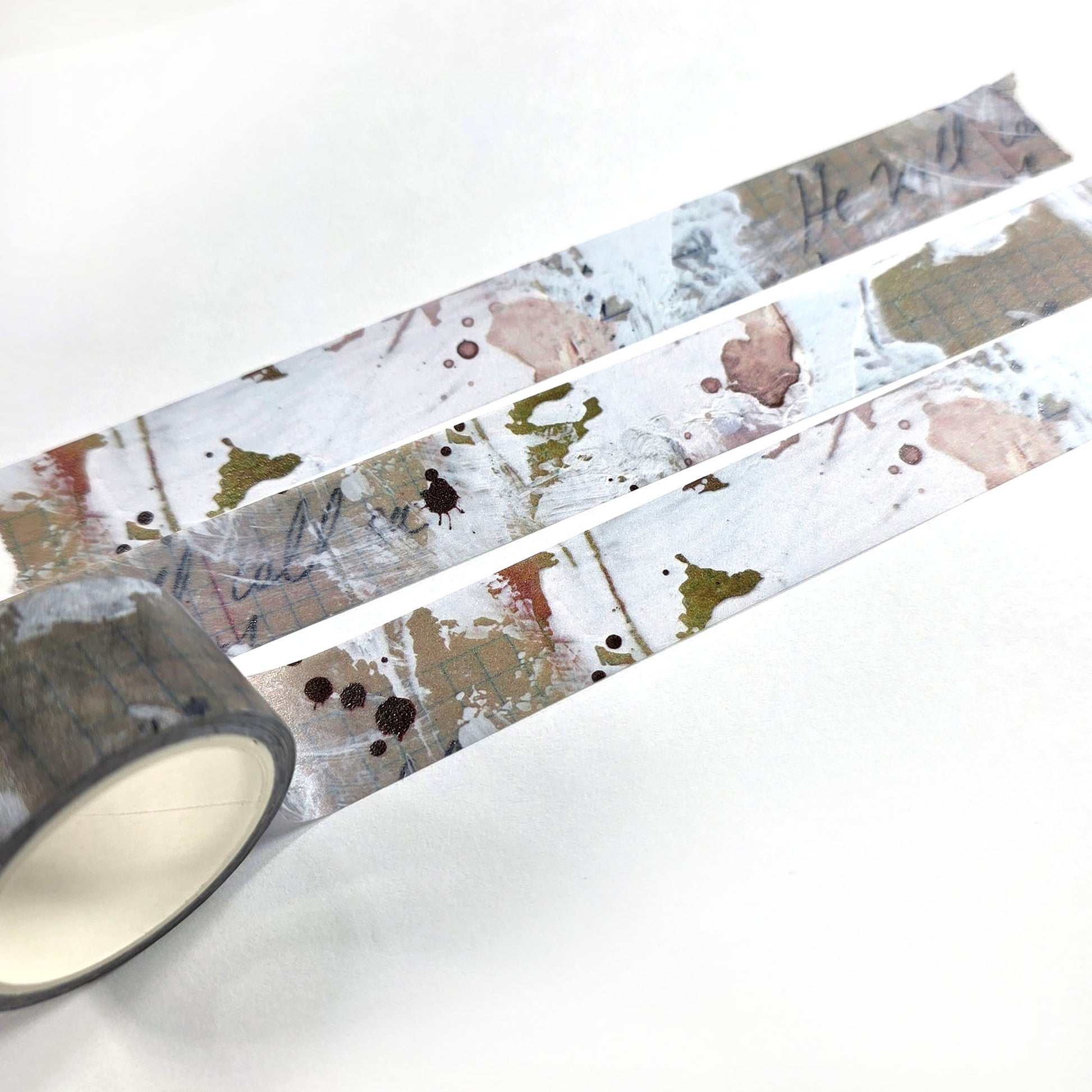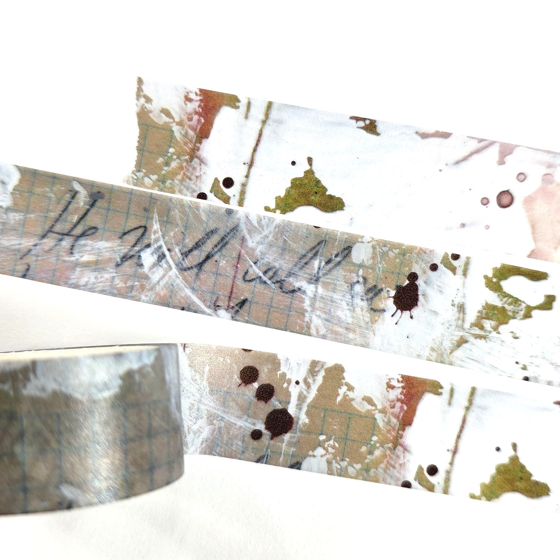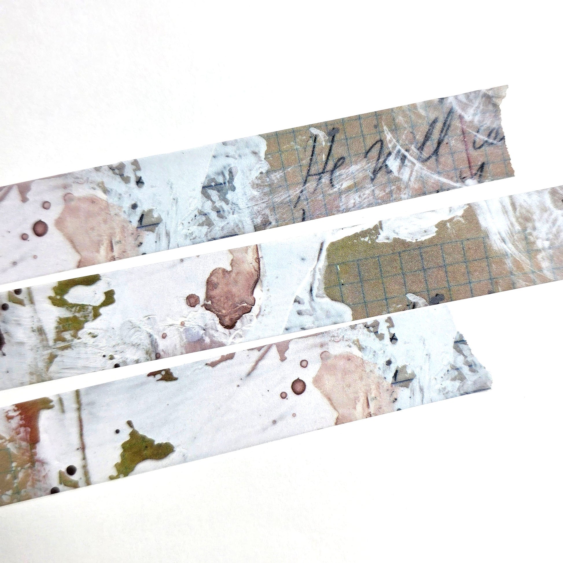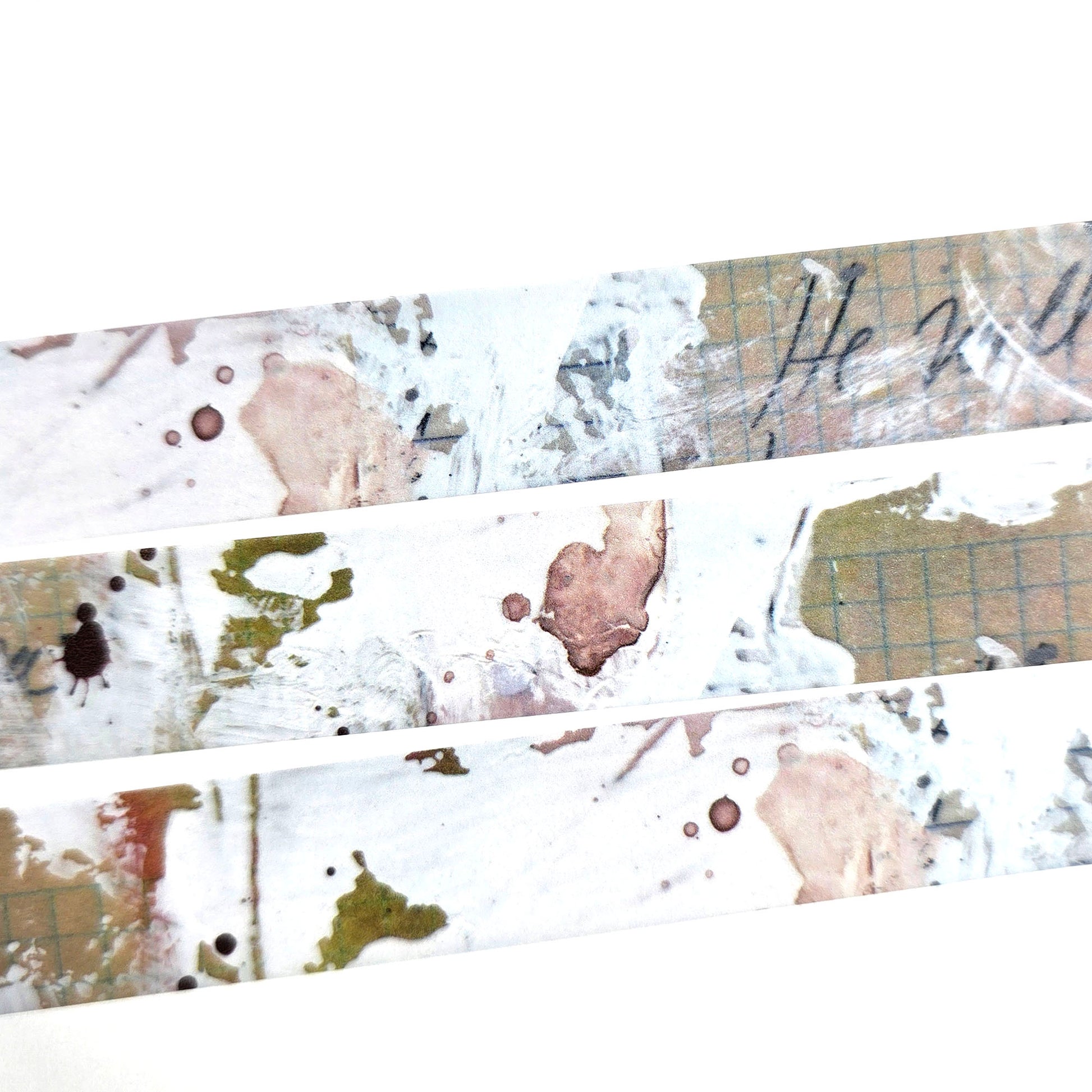 Neutral color palette with marks of plaster and ink splatters, a mix media look washi. The washi tape measures 0.78" wide and 196" long (2cm x 5m).