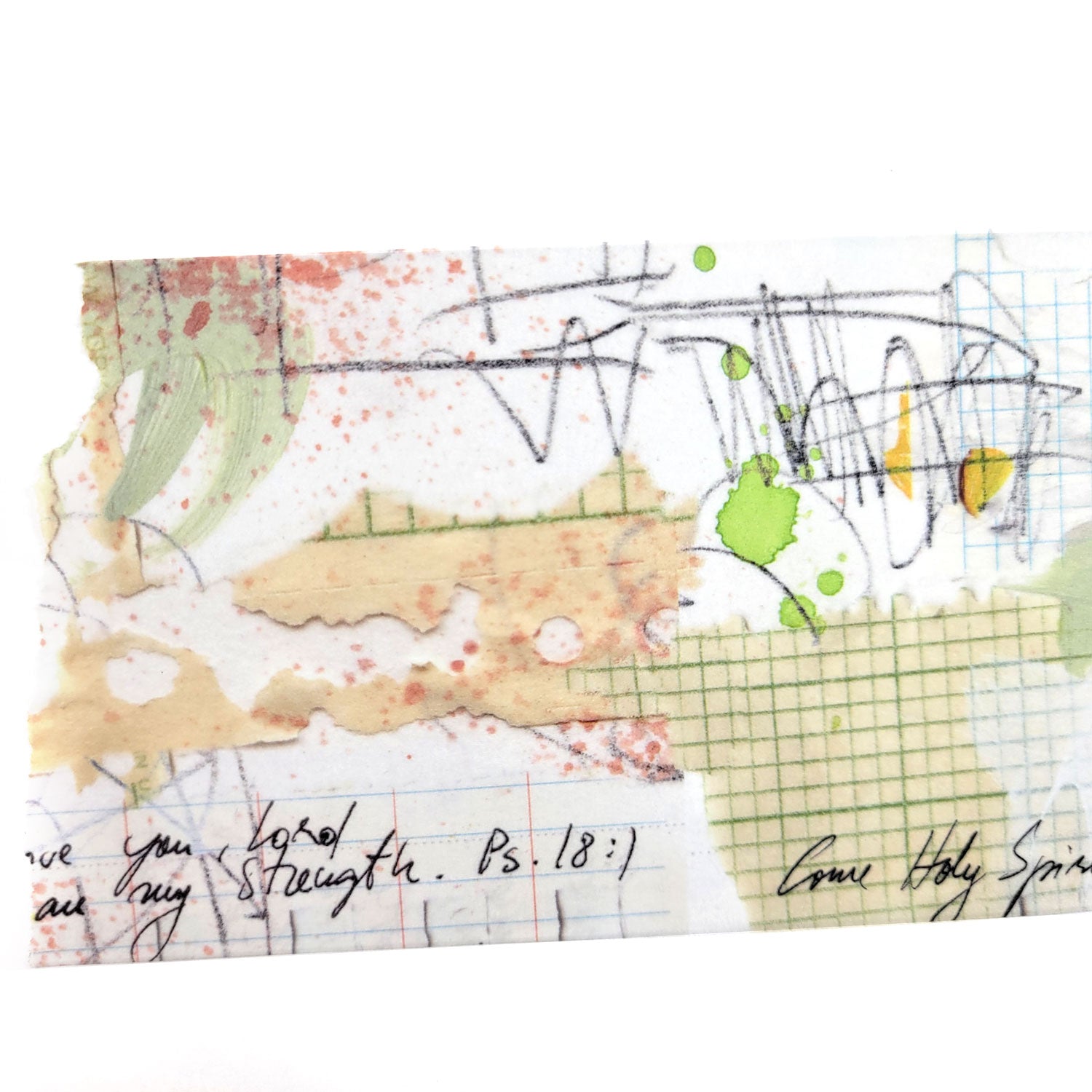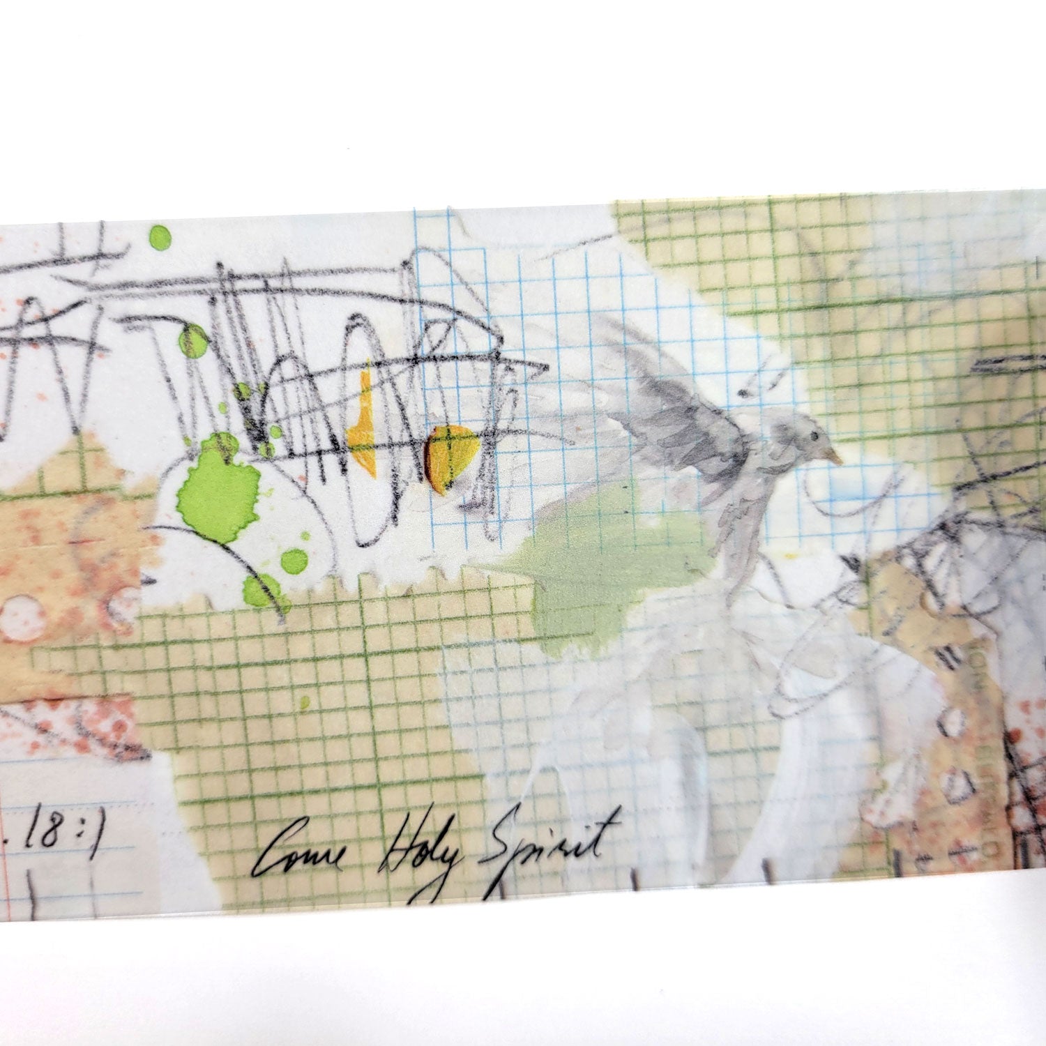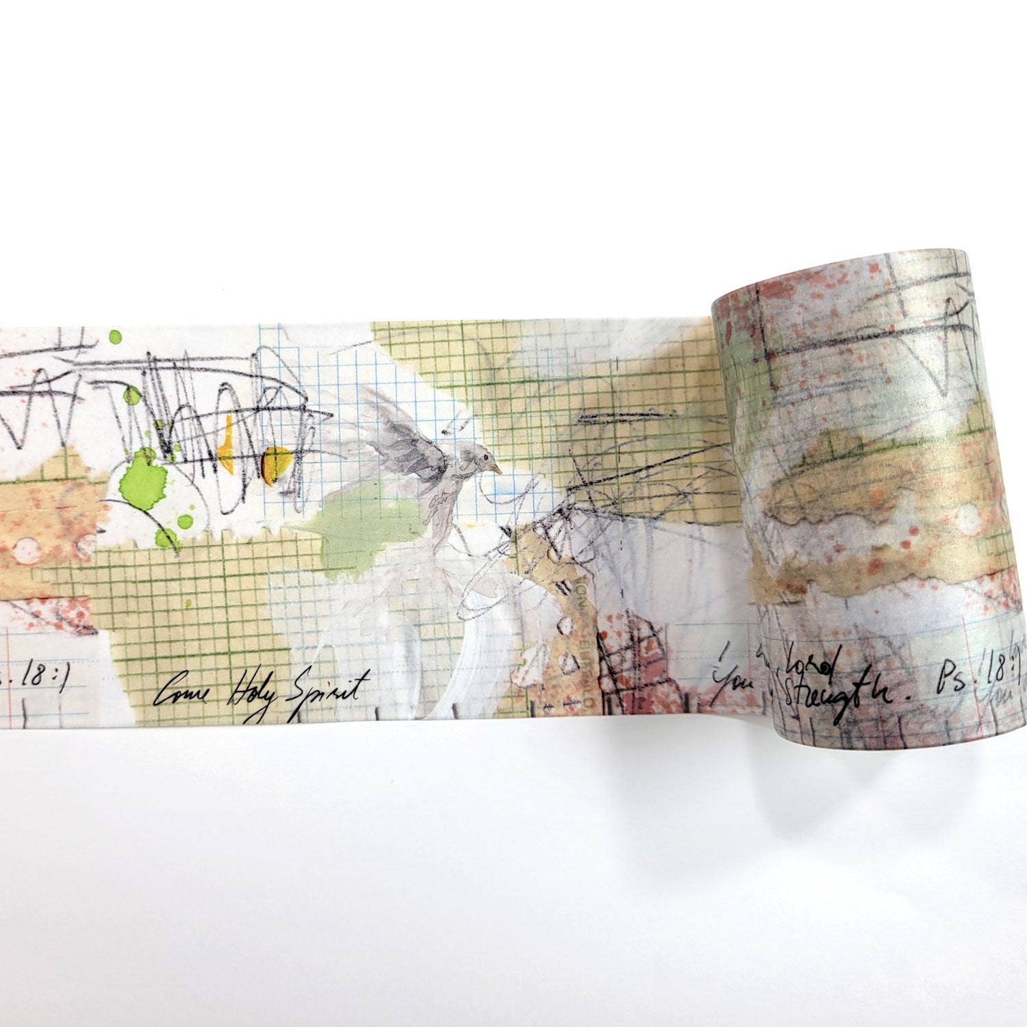The washi tape measures 2.7" wide and 196" long (7cm x 5m). The text on the washi reads: "Come Holy Spirit" and "I love You Lord, You are my strength" Psalm 18:1