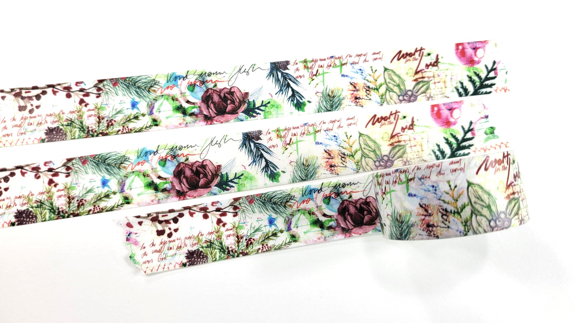 The washi tape measures 0.78" wide and 196" long (2cm x 5m). An Advent themed washi, an ADD ON to the New Beginning kit. The hand written text reads: "In the beginning was the Word and the Word was with God and the Word was God", "The Word became flesh", "no room".