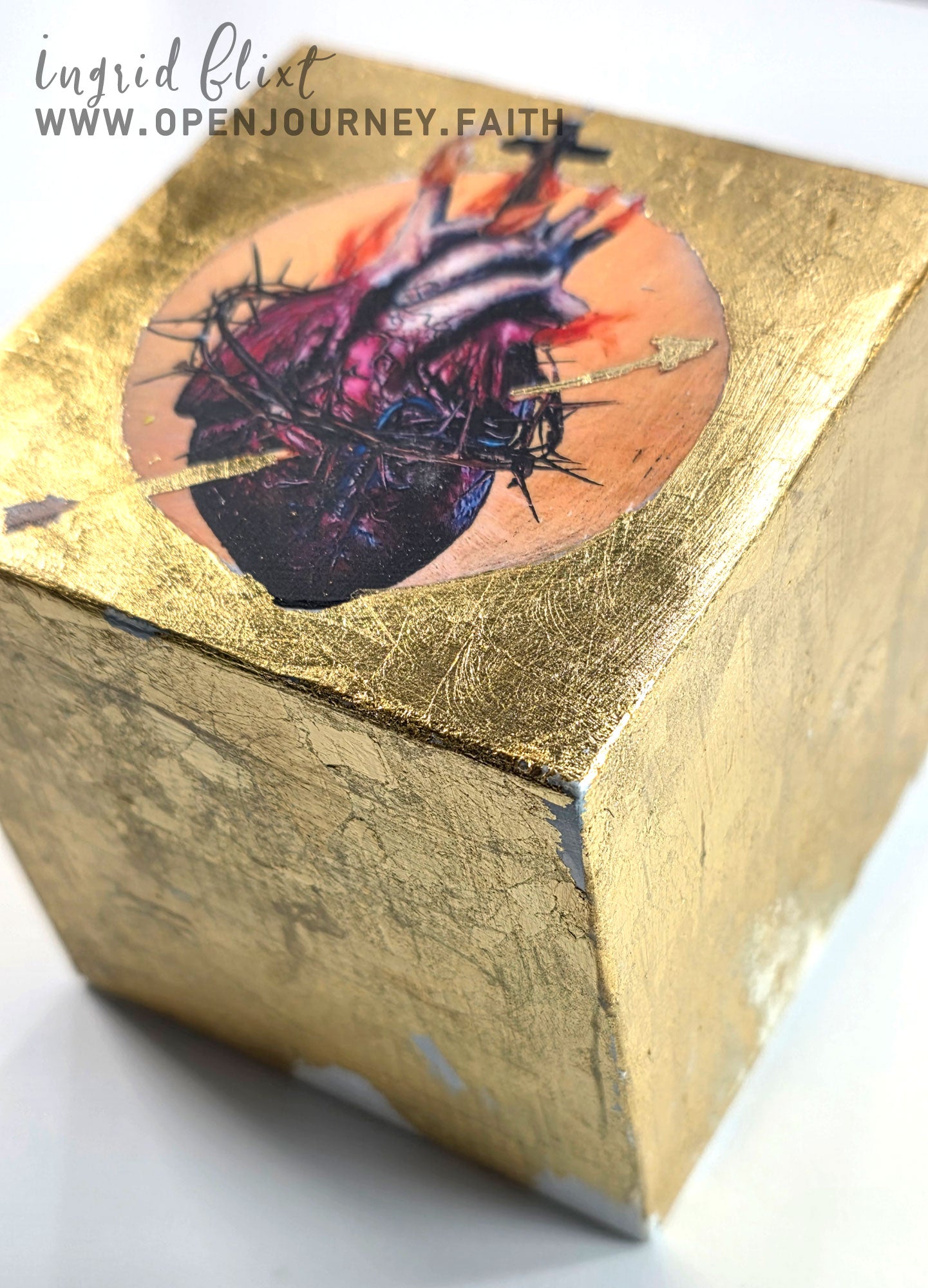 A mix media artwork, depicting the Sacred Heart of Jesus and the Golden Arrow. The Golden Arrow piercing the Holy Heart has a beautiful significance - it represents the Act of Reparation against Blasphemy. (for more info on this check at the end of this listing)