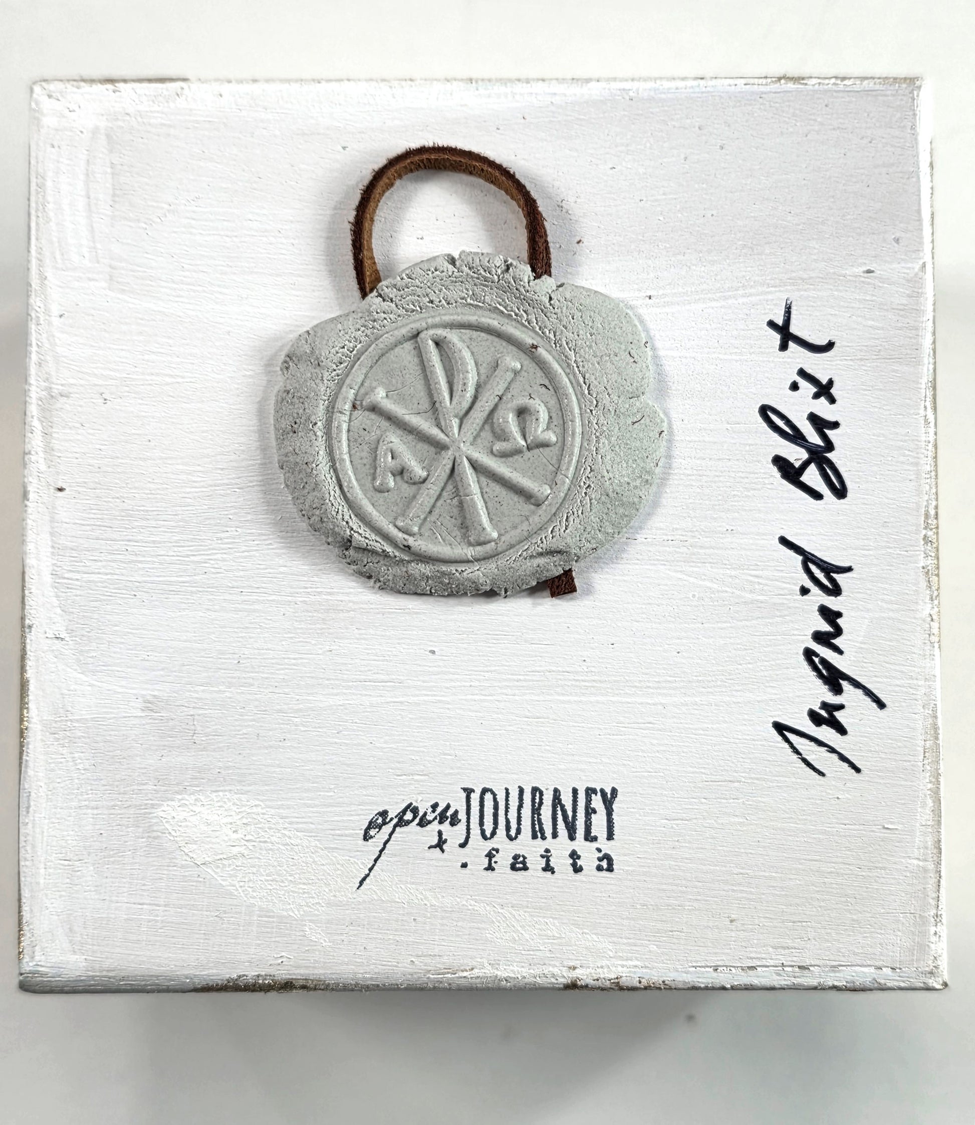 The artwork is done on a wooden cube, measuring 3.5". The sides are finished with gold leaf. The artwork can sit on a shelf or it has a hanging system on the back. Beautiful from all angles!