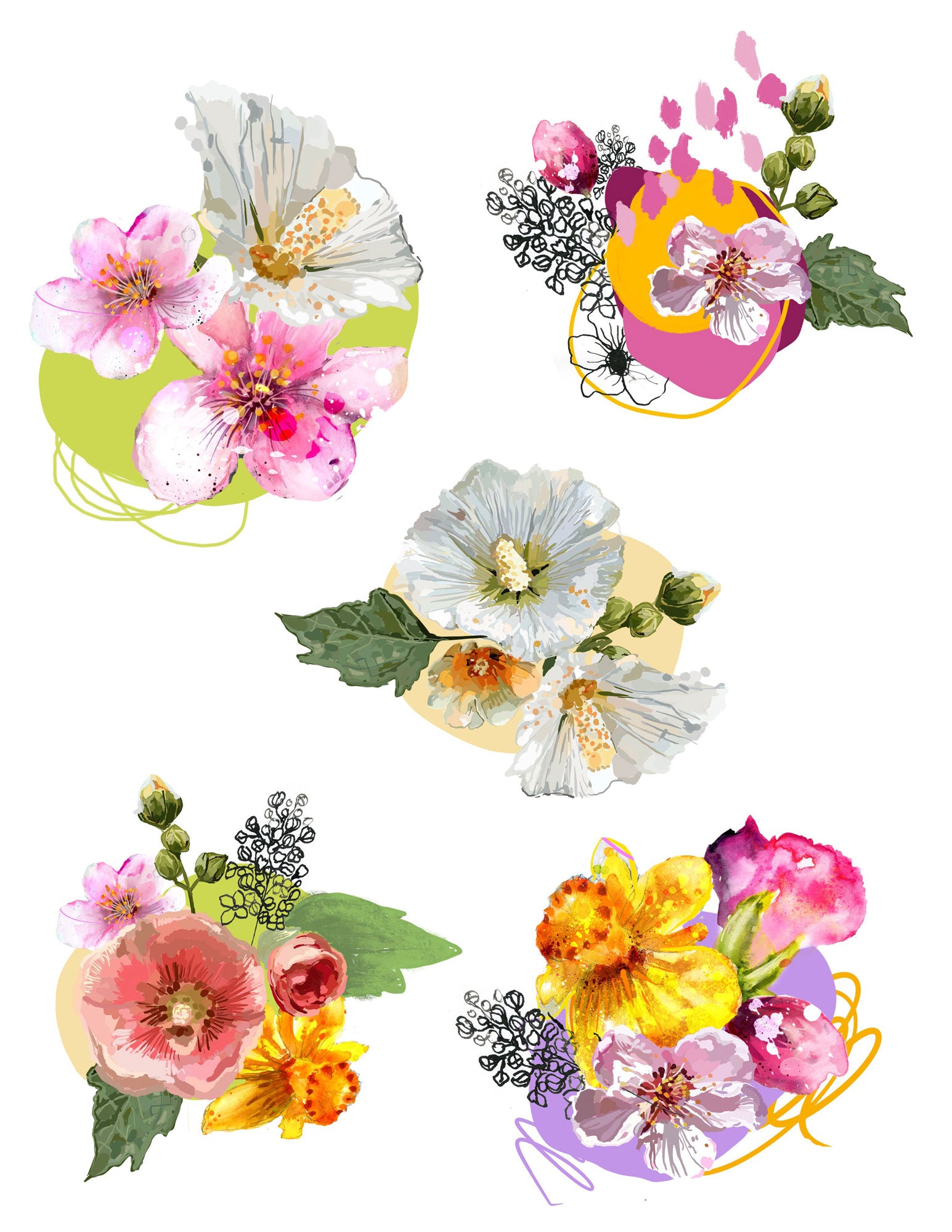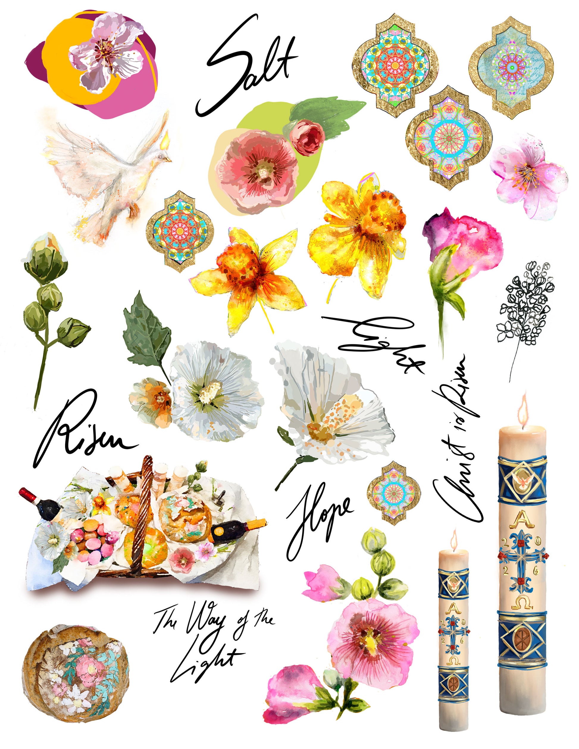The artwork for this kit brings together a variety of mediums from watercolor, acrylics, ink drawings to digitally drawn artwork and photography.