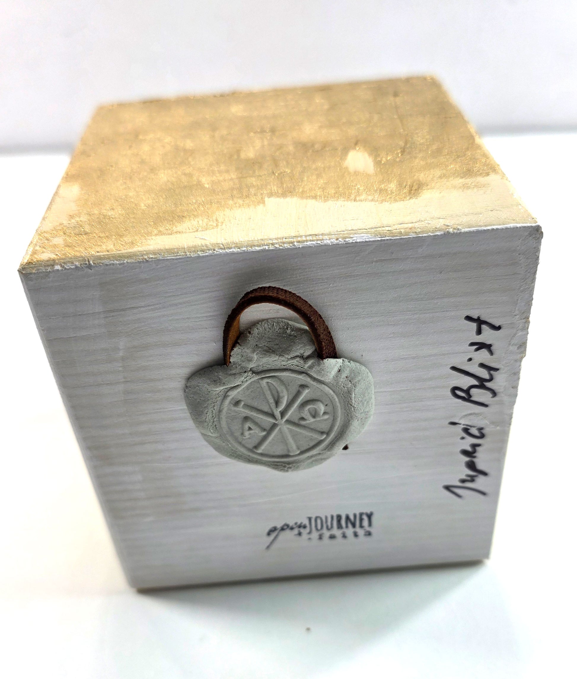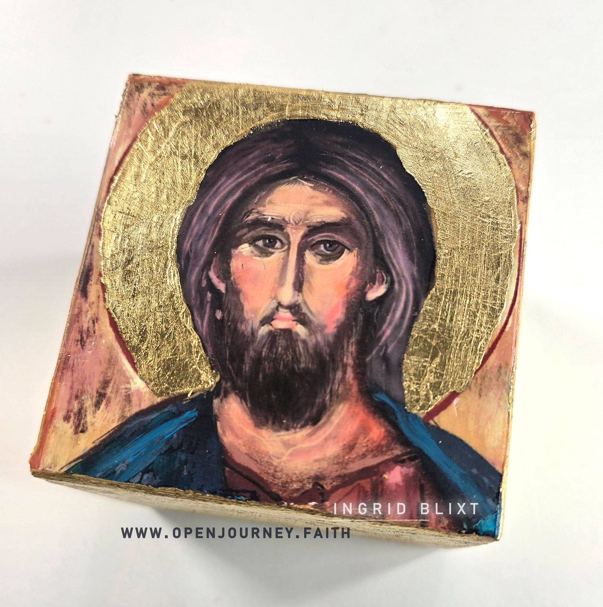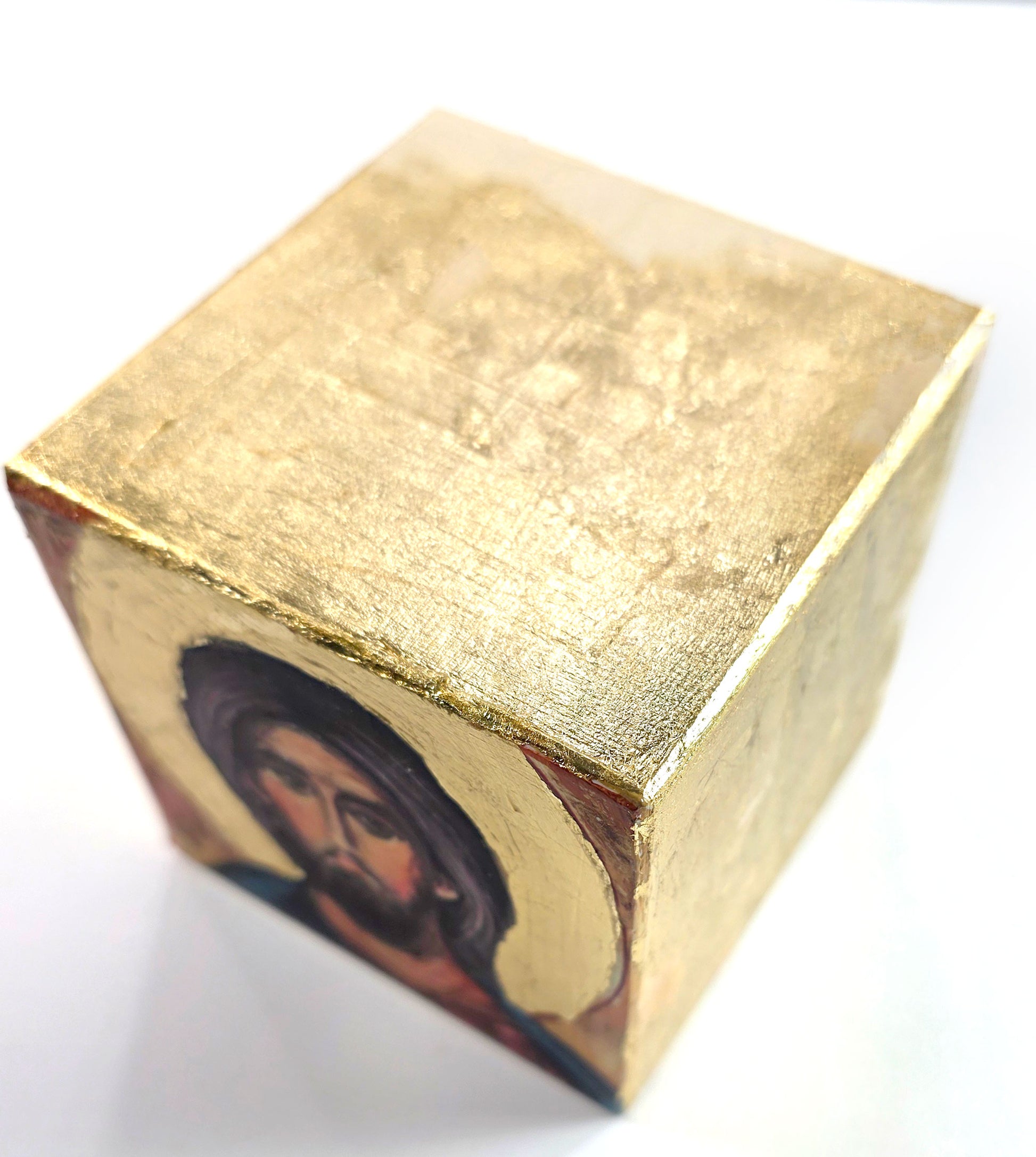A Byzantine style artwork, done on a wooden surface (cube), measuring 3.5x3.5" and 3.5" deep. The sides are finished with gold leaf. The artwork can sit on a shelf or can hang on the wall. Beautiful from all angles!