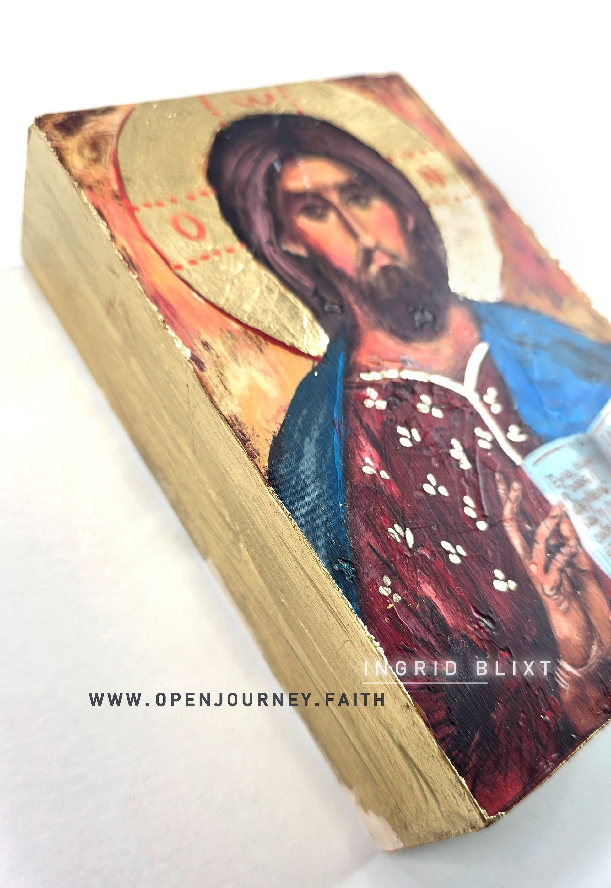 A Byzantine style artwork, done on a wooden surface, measuring 6x4" and 1.5" deep. The sides are finished with gold leaf. The artwork can sit on a shelf or can hang on the wall. Beautiful from all angles!