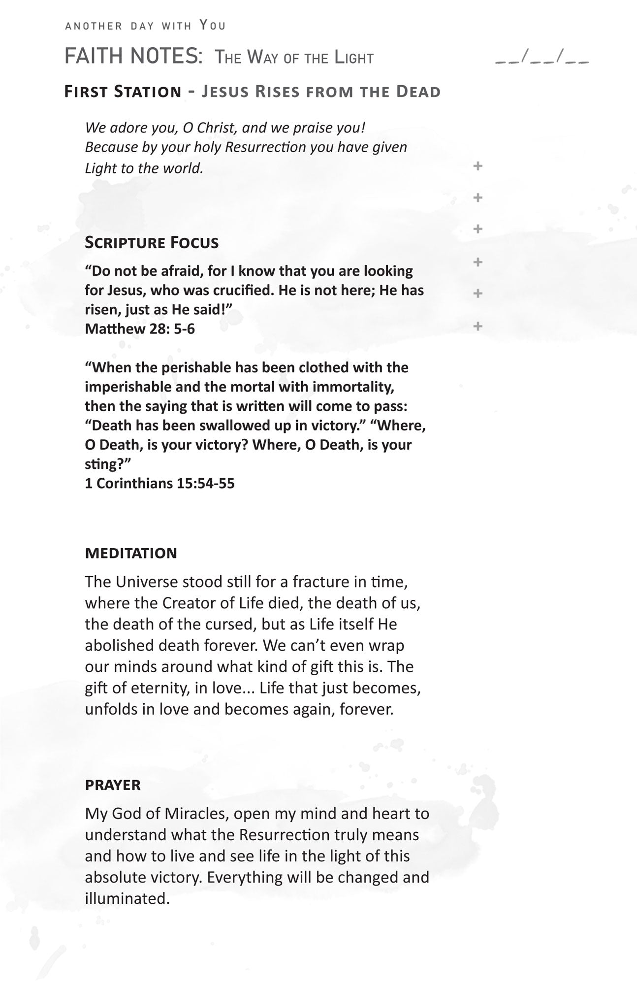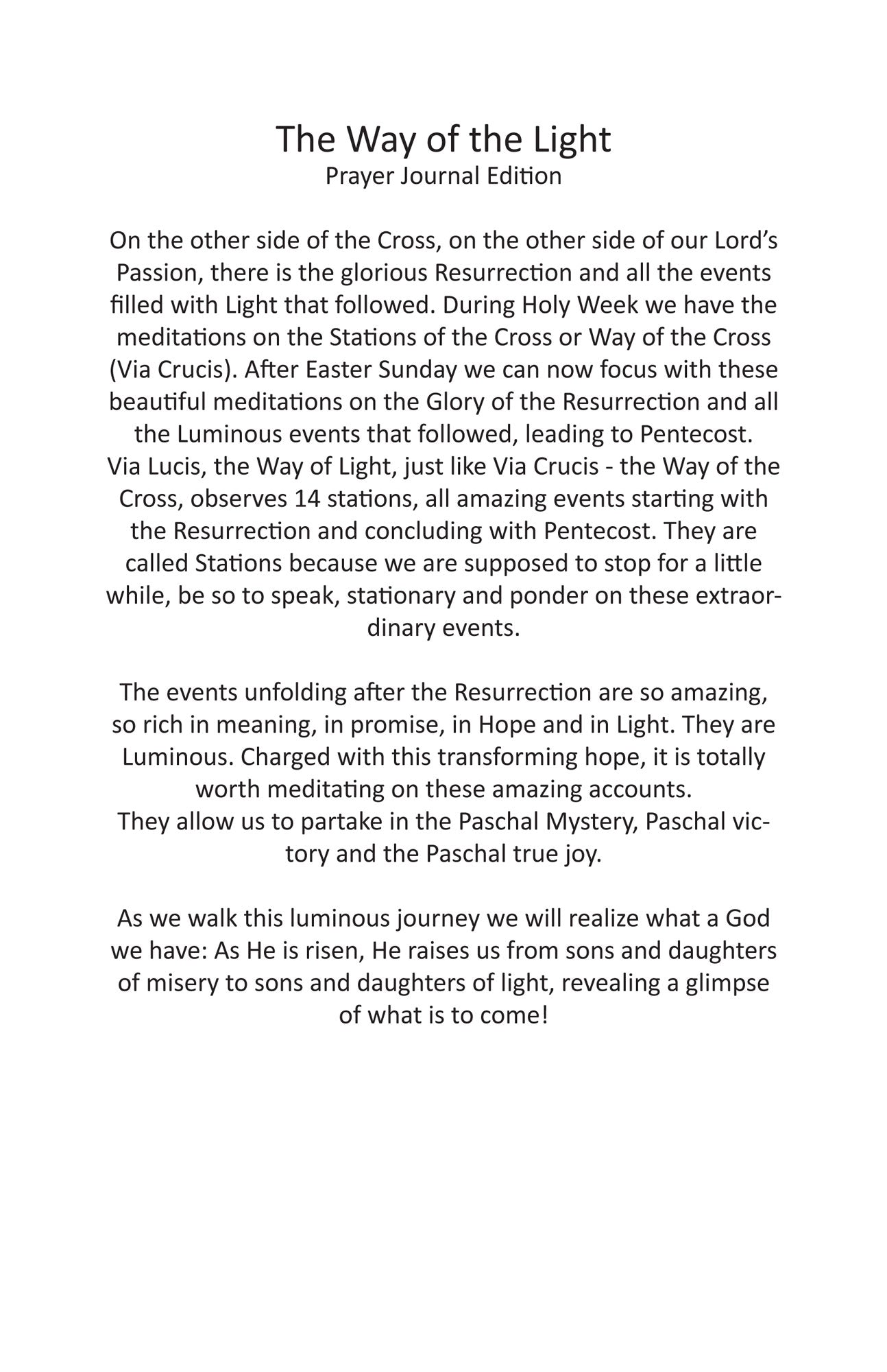 The Way of Light - a series of 14 Biblical Meditations on the beautiful events following the Resurrection. The meditations are following the same structure of the Stations of the Cross (Via Crucis) which we observe during the Holy Week.